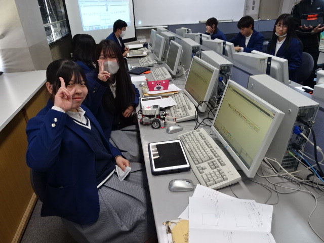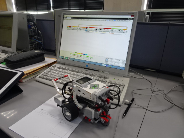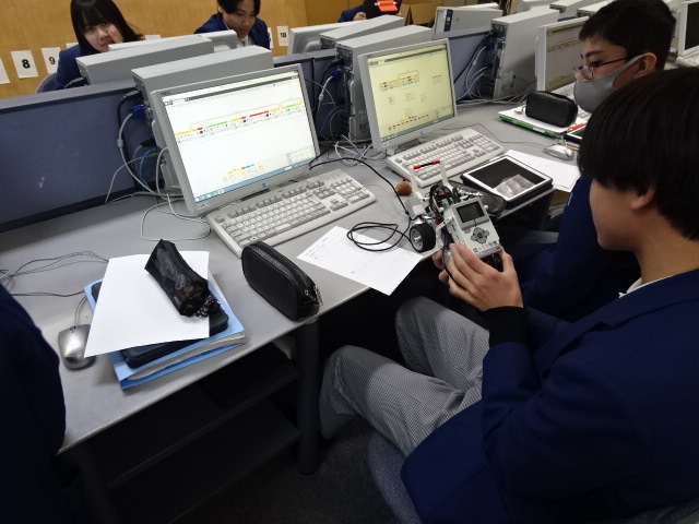3年生技術の授業ではLEGO Educationを利用したプログラミングの授業を実施しています。ロボットにパソコン上から「タッチセンサーを押すごとに、24秒にリセットするカウントダウンし、0秒になったらブザー音を鳴らす」などの指令を出していました。ビジュアルだけ見れば私立学校のように見えます…