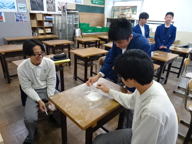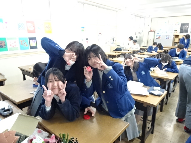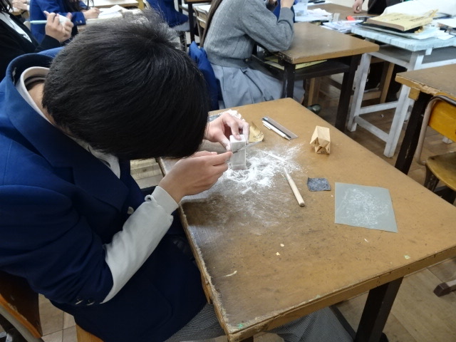 3年美術 ハンコ彫刻 学校生活 Twitter Facebook はてブ Pocket LINE コピー 2026.01.28 3年生美術の授業では彫刻によるハンコ制作を行っています。ほとんどの人が自分の名前を彫刻して、素敵なハンコが仕上がってきています。終わってしまって削ったときにでる「白い粉」で遊んでいる人たちも…(笑) 閲覧数: 23