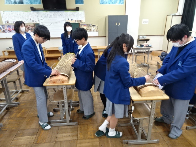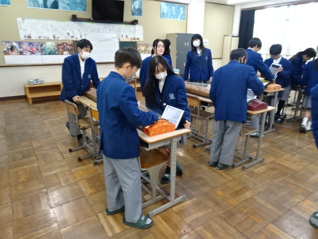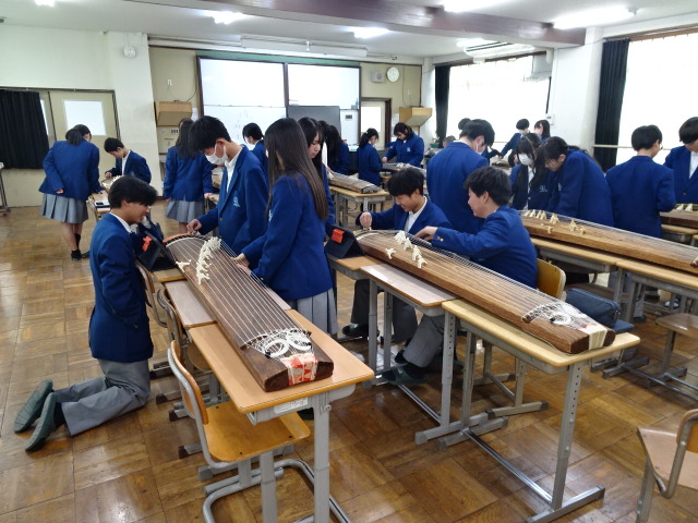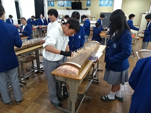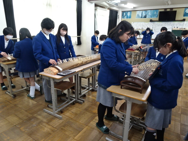 1年音楽 お琴② 学校生活 Twitter Facebook はてブ Pocket LINE コピー 2026.02.09 1年生は音楽の授業で琴の演奏をしています。本日は「さくらさくら」を弾いていましたが、まだまだ不慣れのせいかスローな感じでした。この教室内だけ、まだ正月かと錯覚しそうな優雅な雰囲気🥡 閲覧数: 89