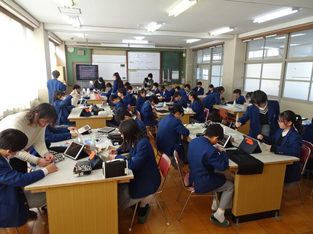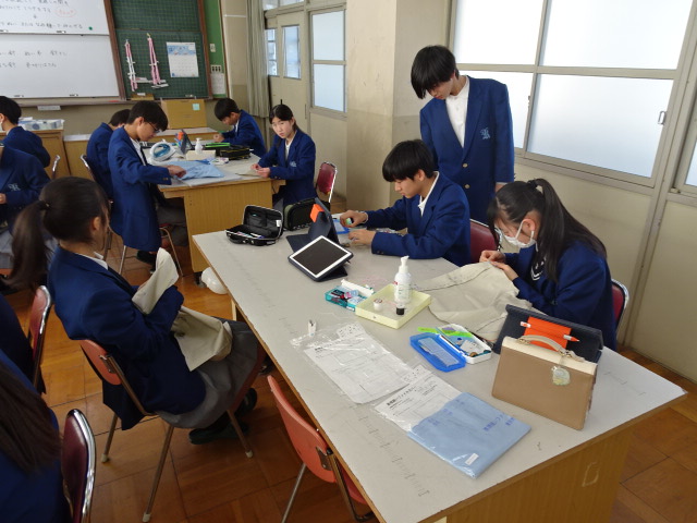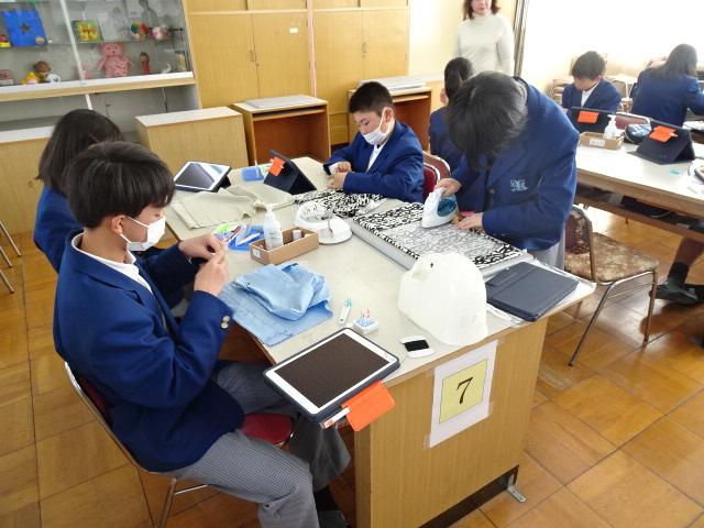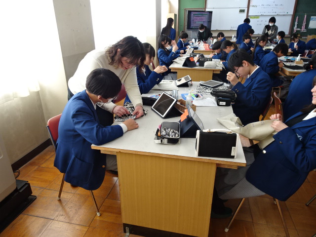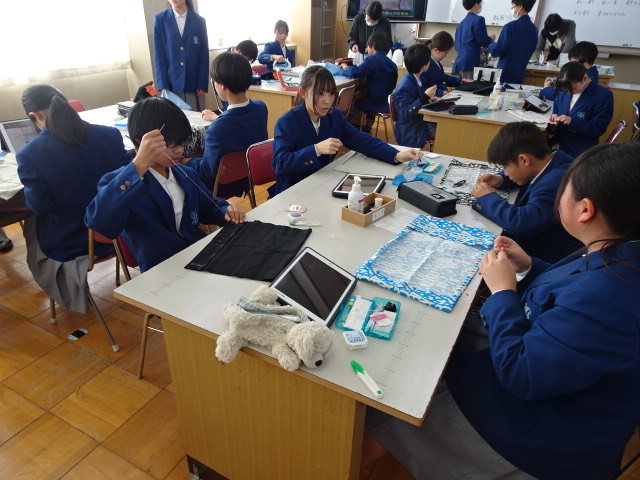 1年生家庭科の授業で長らく続いているファイルカバーづくりも、ようやく仕上がりに向かいつつあります。カバーの形になってきている人もいれば、もうちょっと時間のかかりそうな人も…。大人になってもボタン付けなど裁縫をする機会は結構あるので、しっかりと習得しておきましょう。