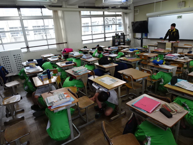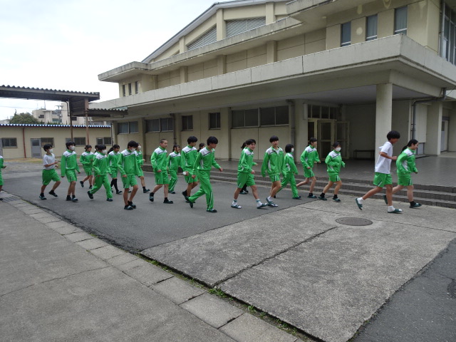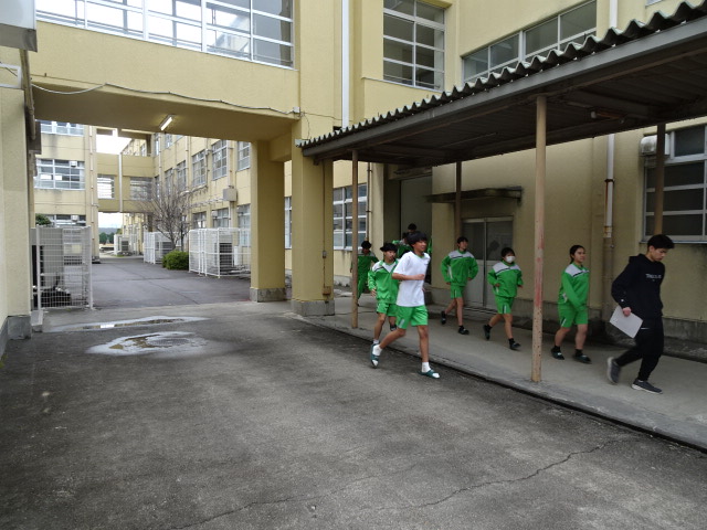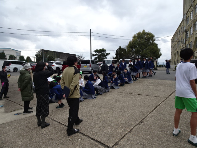 本日の放課後は抜き打ち避難訓練でした。生徒には事前に通告することなく、教職員だけが知っている特殊演習です。終学活終了と同時に地震が発生し、生徒たちはすぐに机の下に避難しますが、同時に火災も発生したことによる緊急避難となりました。また、グラウンドへの出口がふさがれた想定で、正門前というイレギュラーなルートでの避難も兼ねました。