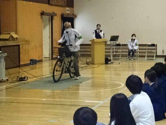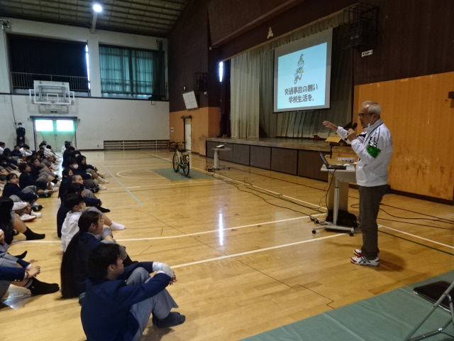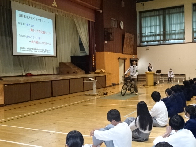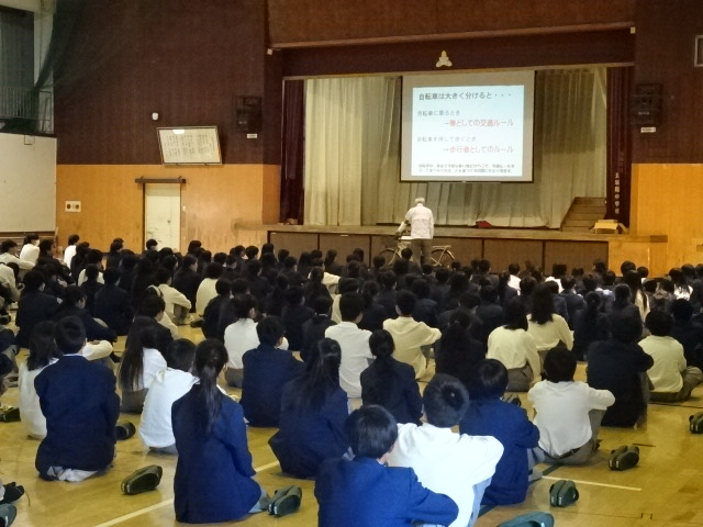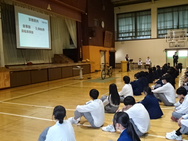 京都府城陽警察署交通課の方を講師としてお招きし、全校生徒を対象に交通安全教室を実施しました。