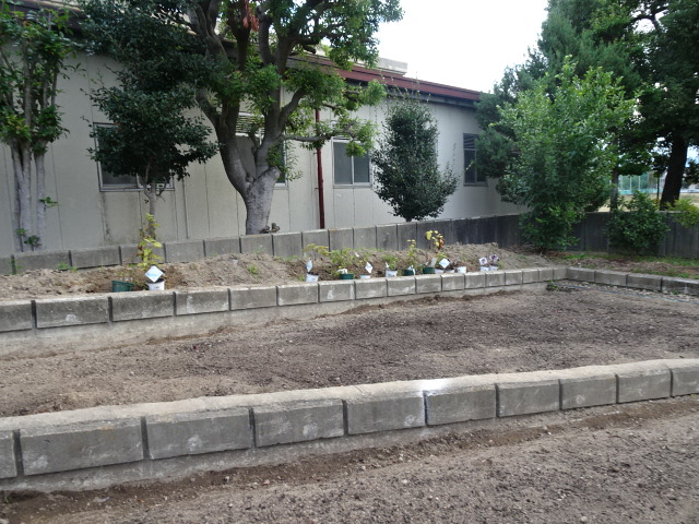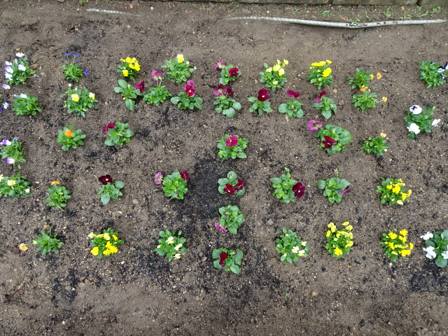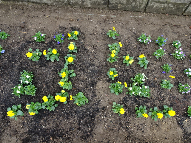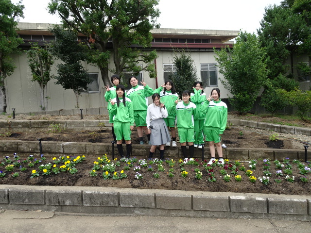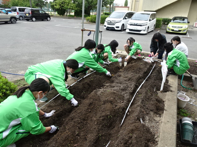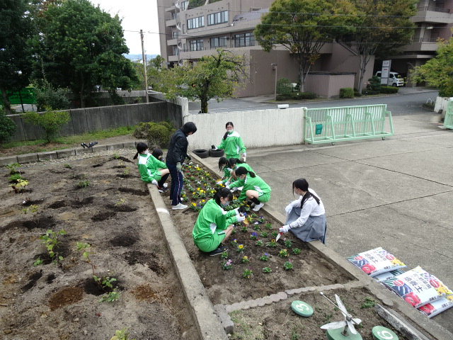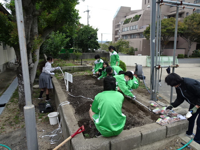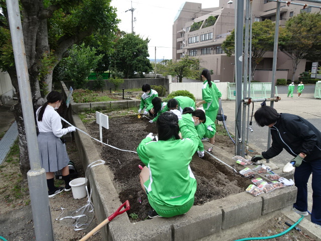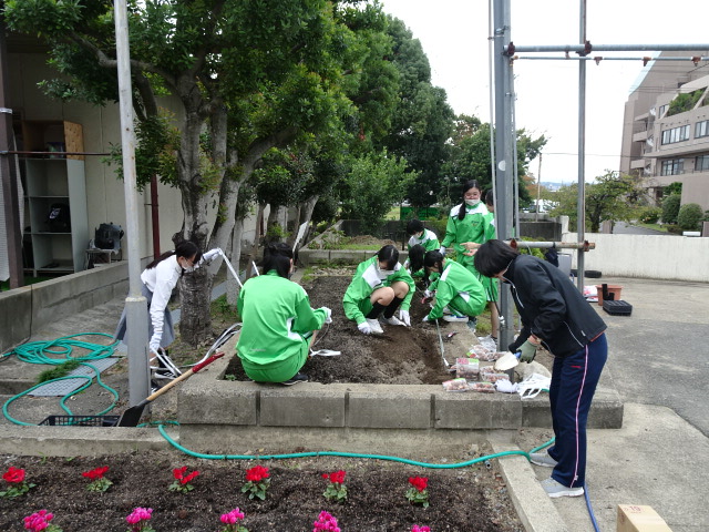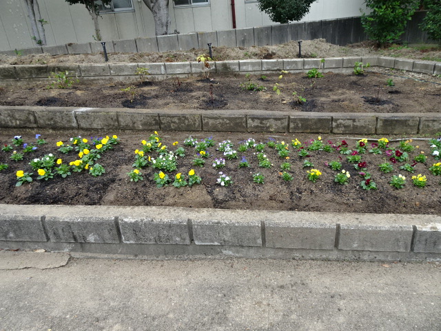 クリーン運動と同時に城陽市の「花いっぱい運動」も実施しました。今年度は各種補助金等を合算して第2ガーデンの大規模開発を行い、美術工芸部がパンジーとビオラで「北中」の文字を描き、さらにチューリップ100本を5色の色別に植えてくれました。その横の段にはアジサイ19本(アナベル15本+日本固有種4本)を植え、ライトアップできるようになっています。来年の入学式~6月にかけてが楽しみです。
