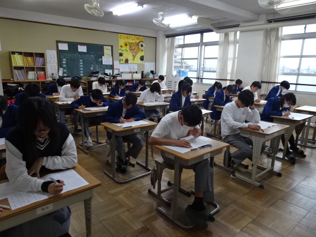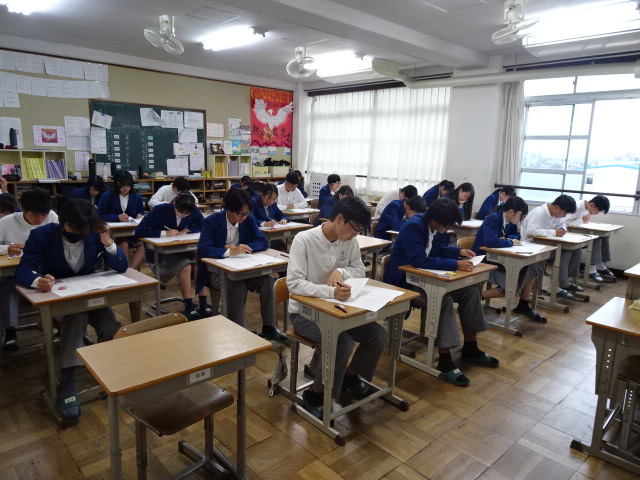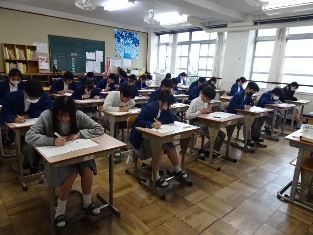 本日1~5校時、3年生は実力テストを実施しています。全4回の結果に加えて3年間の評定をもとに11月10日~進路面談を実施し、この場で概ね進路の方向性を決定することになります。この時期からは過去問をしっかりと解いて問題に慣れていくことが大切です。効率よい学習法を自分なりに見出しましょう。