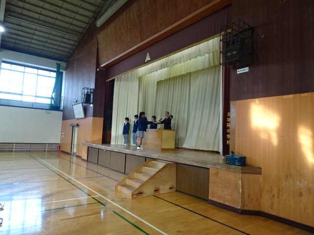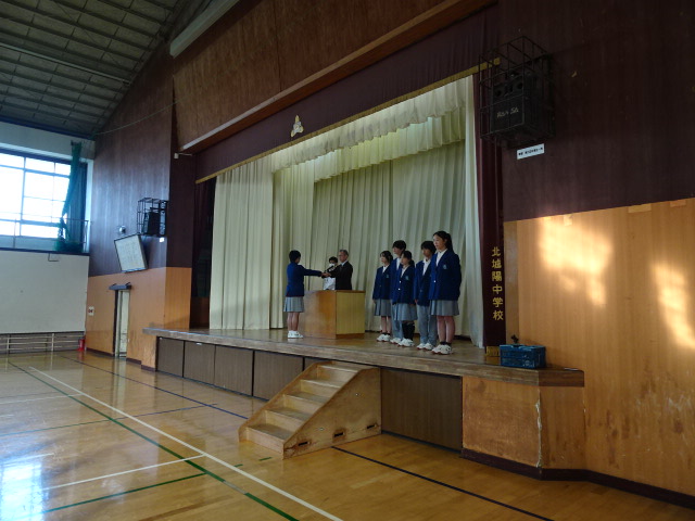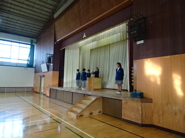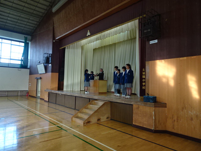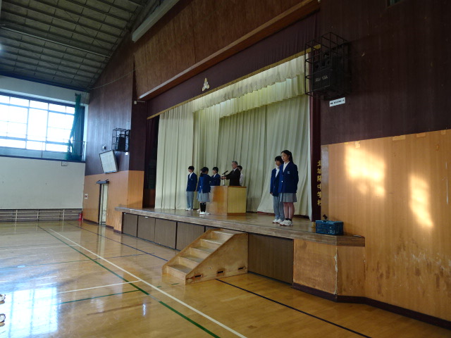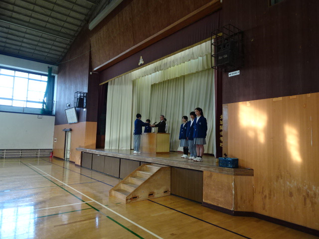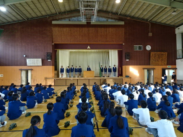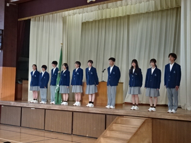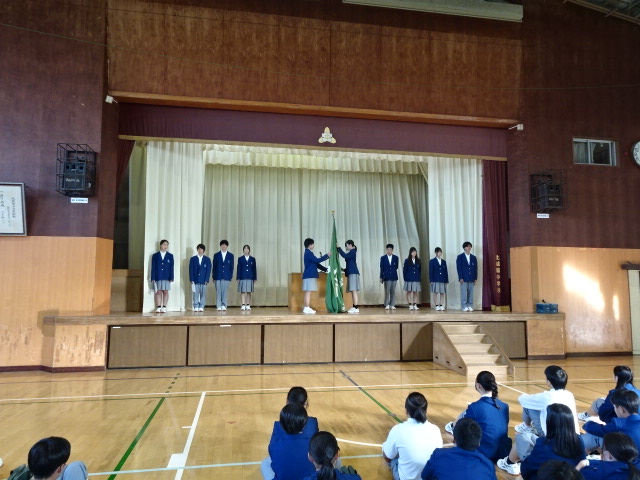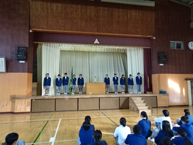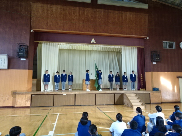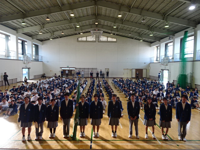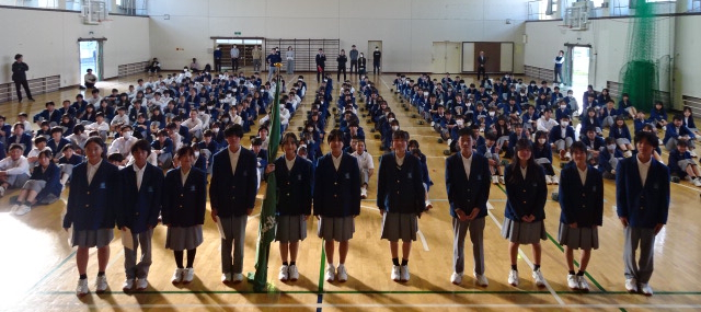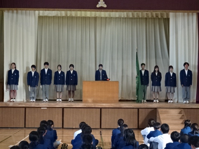 先日行われた生徒会本部役員選挙の結果、すべての候補者が信任され、新生徒会本部役員として本日認証されました。6名の当選者が呼名され認証された後、旧生徒会長のあいさつ、生徒会旗の引継ぎ、そして新生徒会長の所信表明が行われました。今月から各学級でも新しい学級委員や委員会メンバー等が選出されます。新しいリーダーを中心に学校生活をよりよいものにしていきましょう!