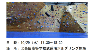 ワンダーフォーゲル部 6月26日(木)に地域公開ボルダー教室を開催しました。 蒸し暑い中、参加していただきありがとうございました。 生徒が先生となり教えたり、一緒に登って競うなど楽しい時間になりました。 今後も続けていきます。開催日程はホームページをご確認ください。 ... 2025.07.02 ワンダーフォーゲル部部活動
