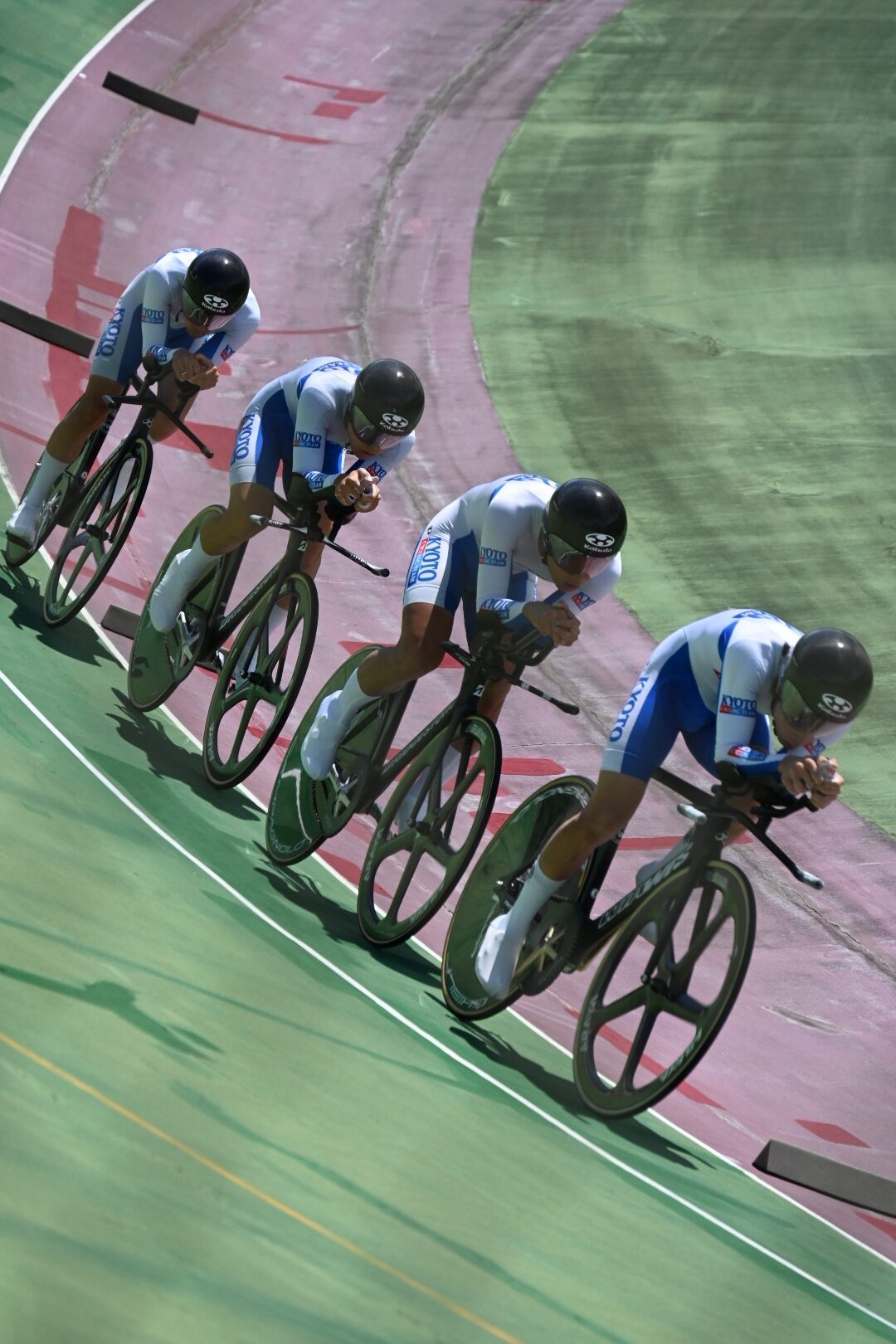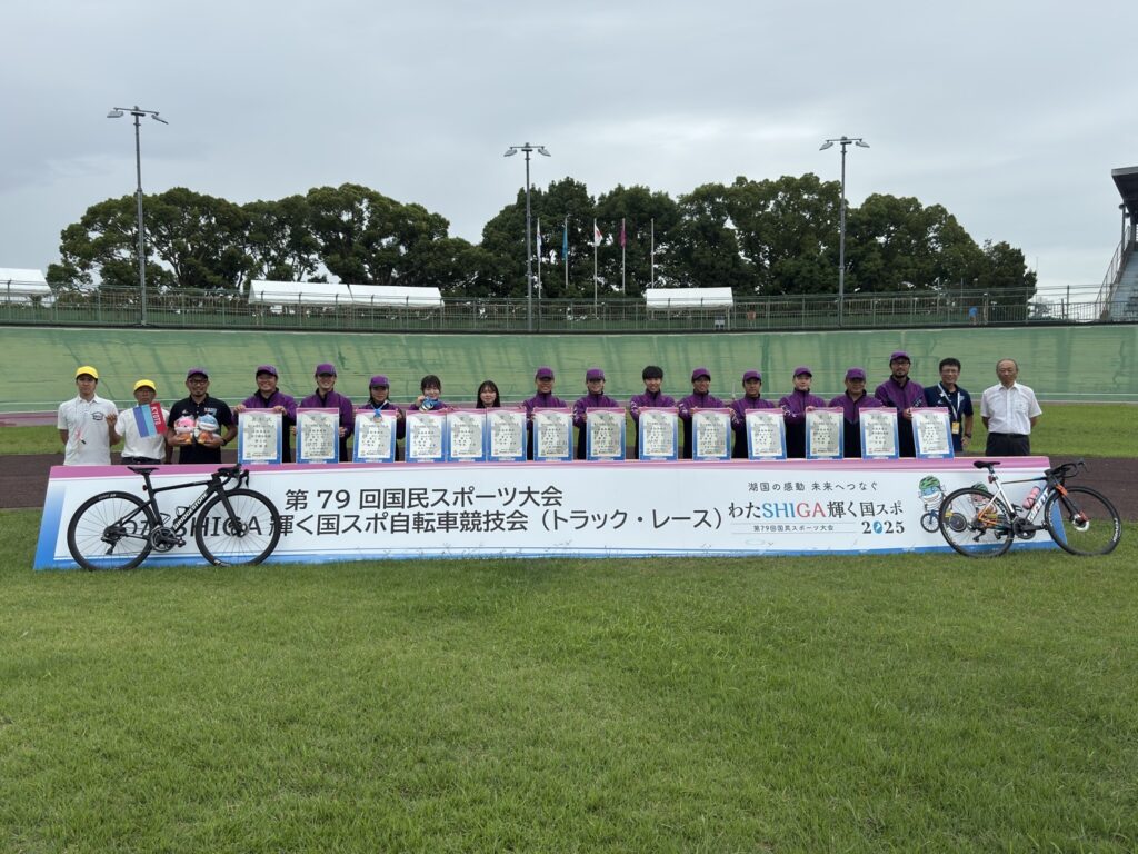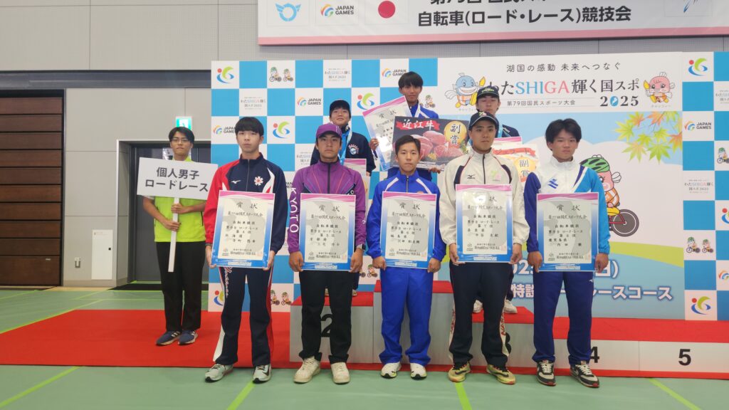 滋賀県で国民スポーツ大会自転車競技が、9月21日(日)から9月25日(木)に開催されました。ロードレースは滋賀県の東近江市を、トラック競技は京都府の向日町競輪場を会場に競技が行われました。9月21日(日)に実施されたロードレースでは、男子B(少年)のカテゴリーで出場した3年生の三宅巧士が、積極的なレースを展開して先頭集団で走り切り、5位入賞を果たしました。また、9月22日(月)から9月25日(木)まで実施されたトラック競技では、男子の4㎞チーム・パーシュートに本校の卒業生である三宅(中央大)・西村(関大)・小久保(明治大)と3年生の柴田渓佑の4人が出場し、6位入賞を果たしました。男子個人では、3年生の小椋琥心がケイリンの決勝戦に出走し、4位入賞を果たしました。女子では、3年生の西原夕華がケイリンで1位、1㎞タイムトライアルで3位、卒業生の岡本(早大)とペアを組んで出場したチームスプリントで2位と、出場した3種目で表彰台に立つ活躍を見せてくれました。
