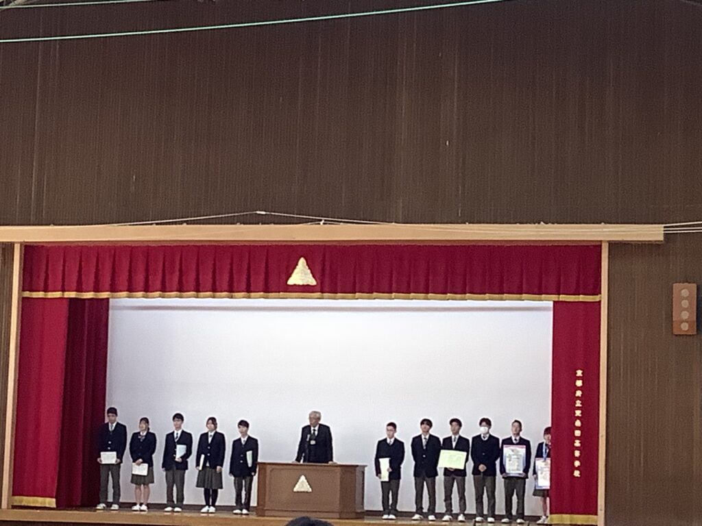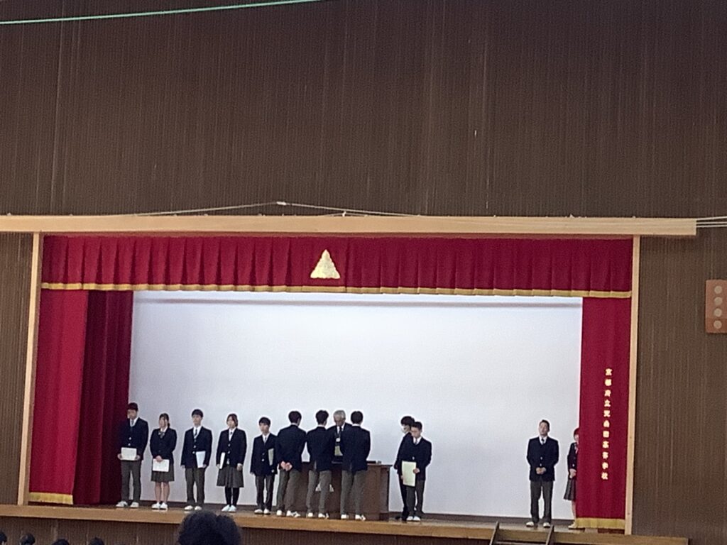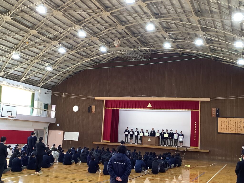 終業式の後には伝達表彰があり、部活動の大会や各コンクールでの受賞者が全校生徒を前に表彰されました。