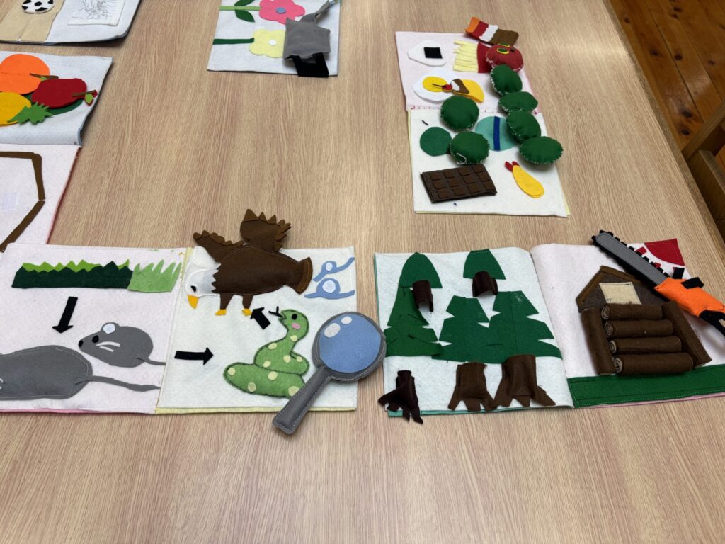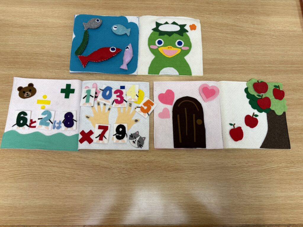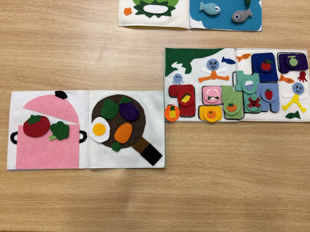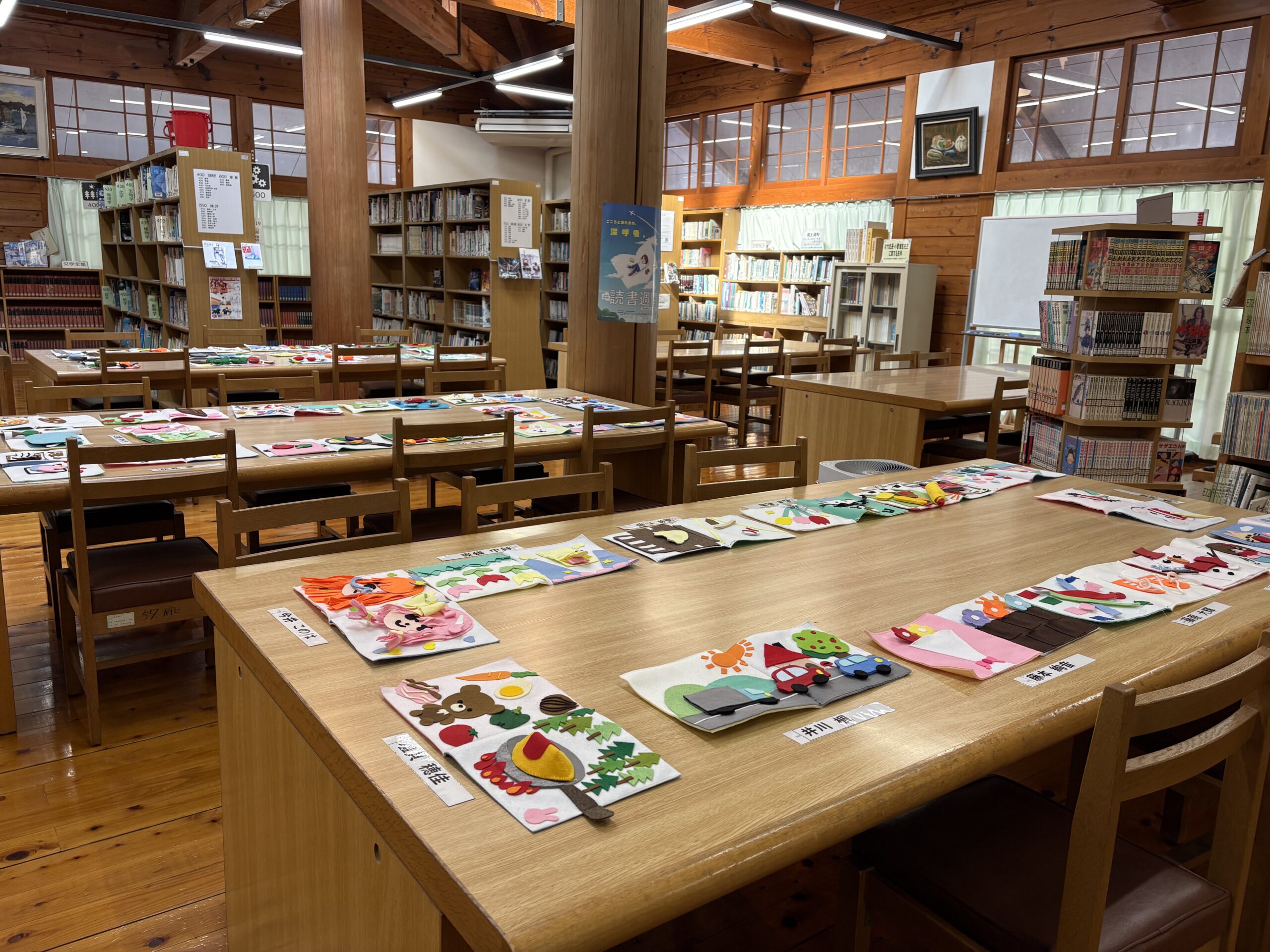 布絵本はそれぞれ幼児の発達段階や興味関心、安全面に配慮した力作揃いとなりました。図書館で展示しており、期間中に図書館の来館者も手に取って楽しんでいました。