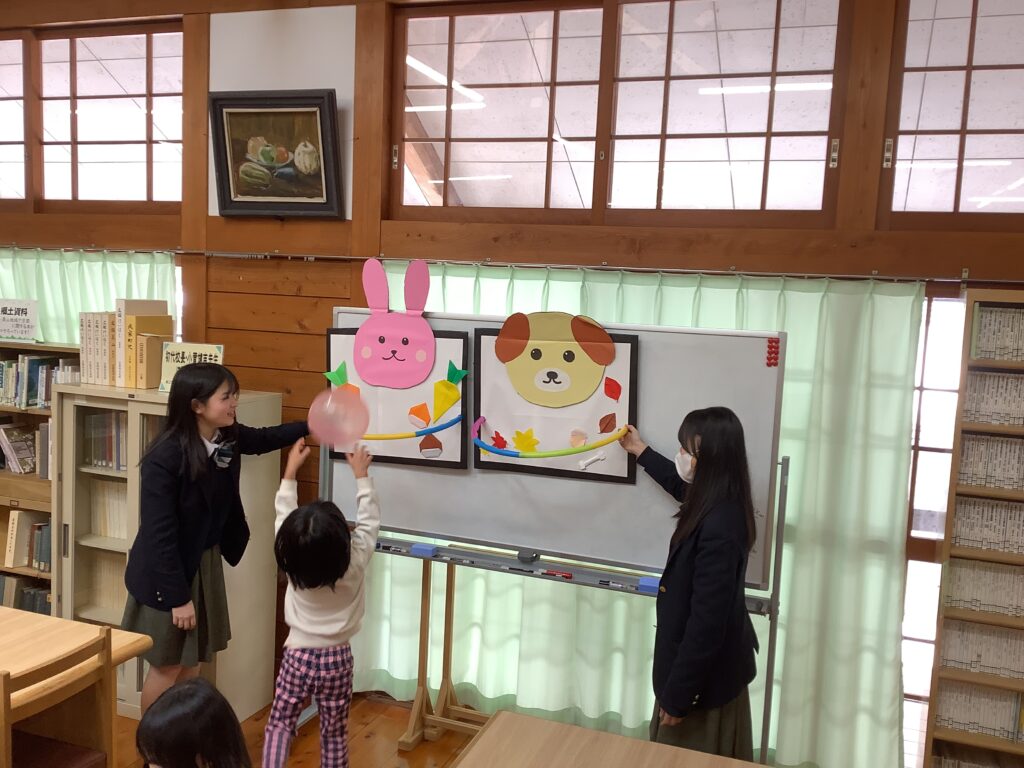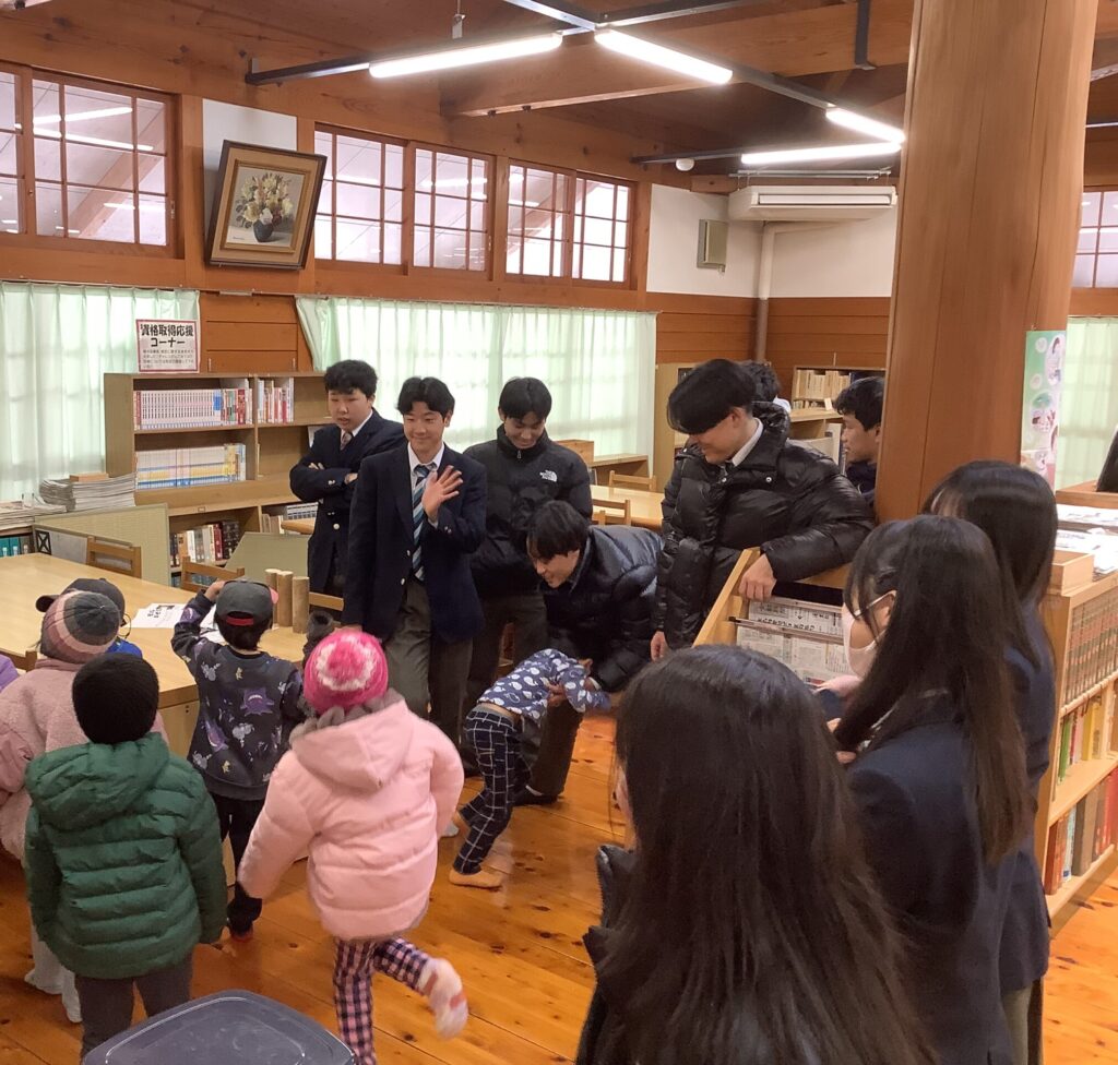 本校図書館にて弓削保育所から来校された幼児さんのみなさんと高校生の交流会を行いました。