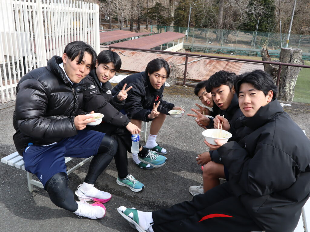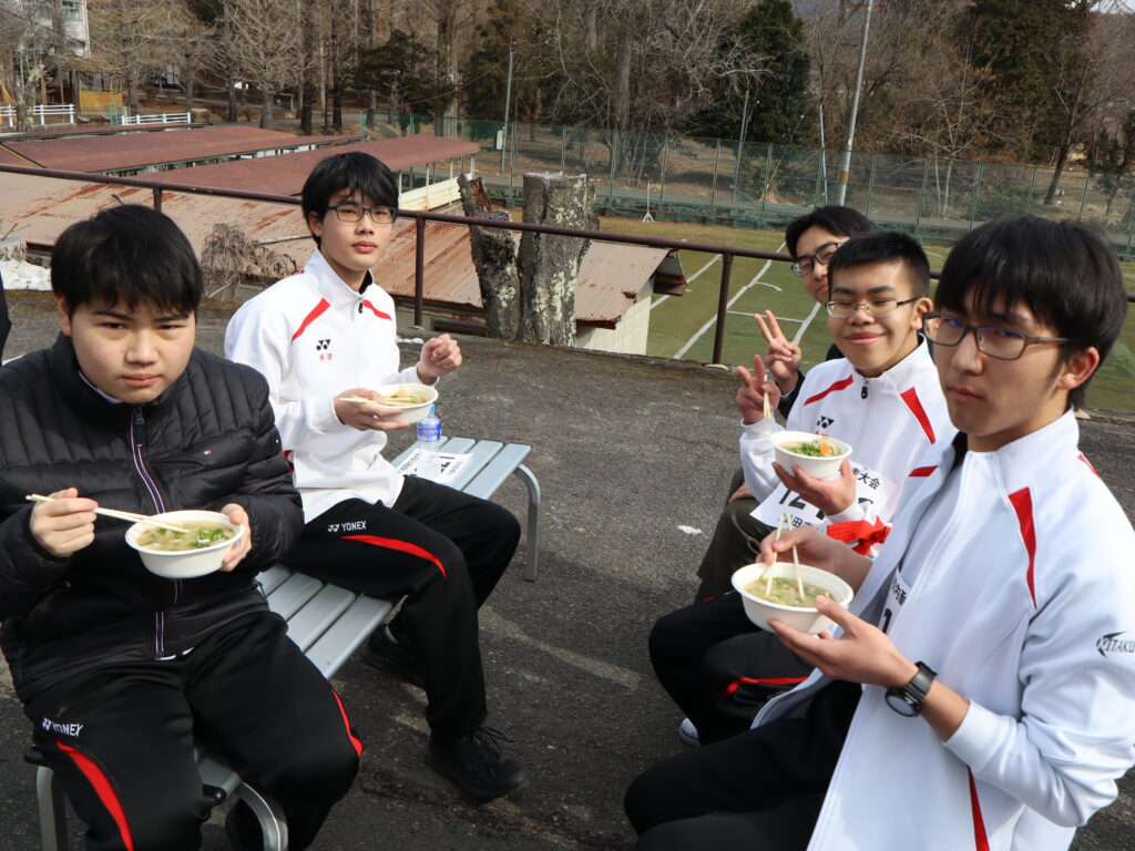 当日は、PTAから手作りの豚汁とスポーツ飲料を提供いただきました。走った後に皆で青空の中、食べる具だくさんの豚汁は身に染みておいしく、何杯もお代わりする生徒が多く見られました。