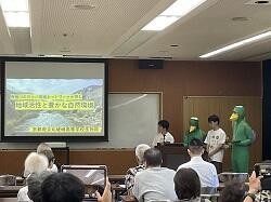 初日のブース出展では、生物部のマスコットキャラクター『カッピー』に扮し、川のいきものについてまとめた「いきものカード」を子どもたちに配布しました。また、プラナリアの実物を顕微鏡で観察できるスペースを設けました。活動発表では、『有栖川のカッパ流域ネットワークが育む地域活性と豊かな自然環境』と題し、発表を行いました。