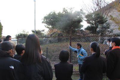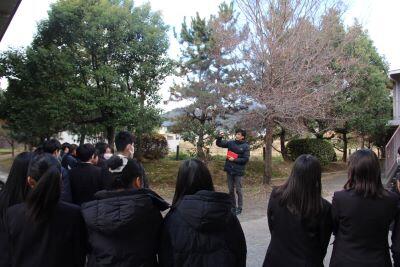 北嵯峨高校のグラウンド下や敷地に隣接している3つの古墳や、北嵯峨高校の3・4棟の建築に関するヒミツについて、普段何気なく過ごしている学校の景色をじっくり味わいながら見て回りました。