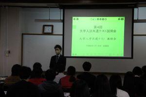 初めに進路指導部から受験上の注意があり、持ち物の準備や会場までの行き方の確認、当日の受験中に気を付けるべきことなどについて、安心して受験に臨めるよう細かく説明がありました。