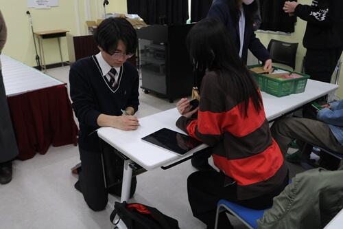 参加した1・2年生は集中した様子でしっかりと先輩の言葉を受け止め、会が終了してからも先輩に質問にいって話し込んでいる生徒や枠に収まりきらずびっしりと感想文を書いている生徒など、「聞けて良かった」、「私も頑張ろうと思う」という感想があちらこちらから聞こえてきました。