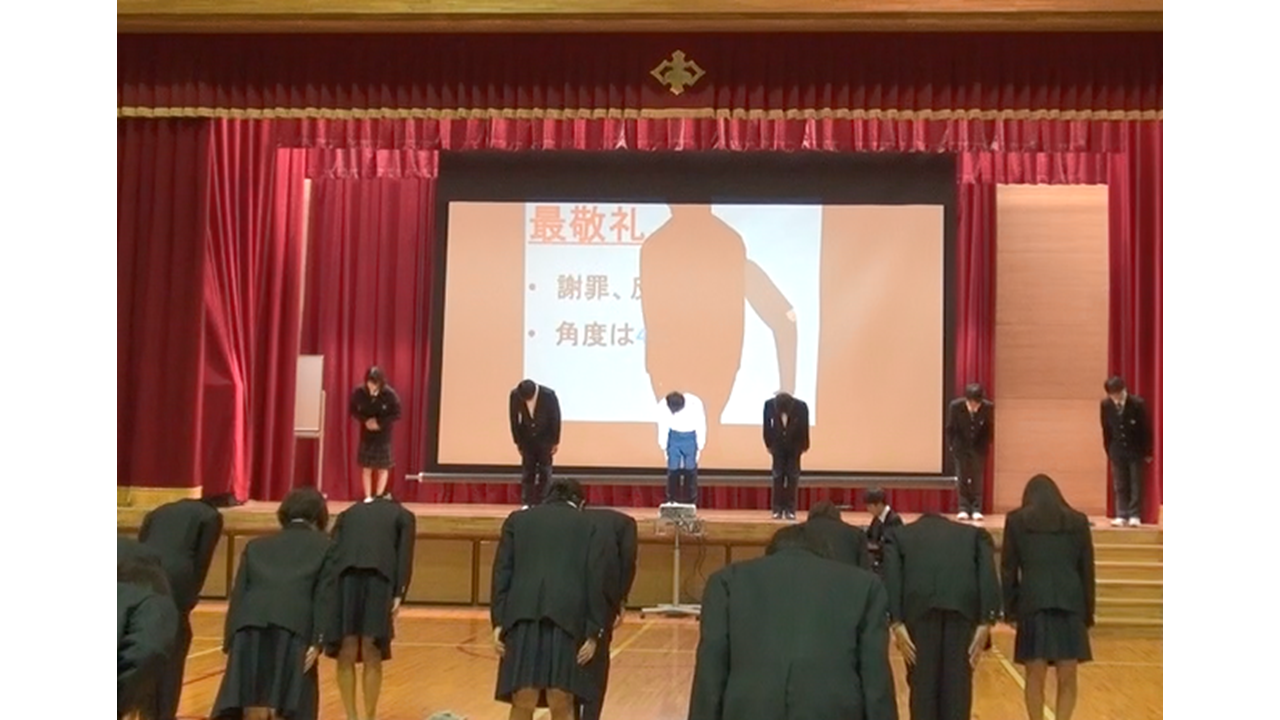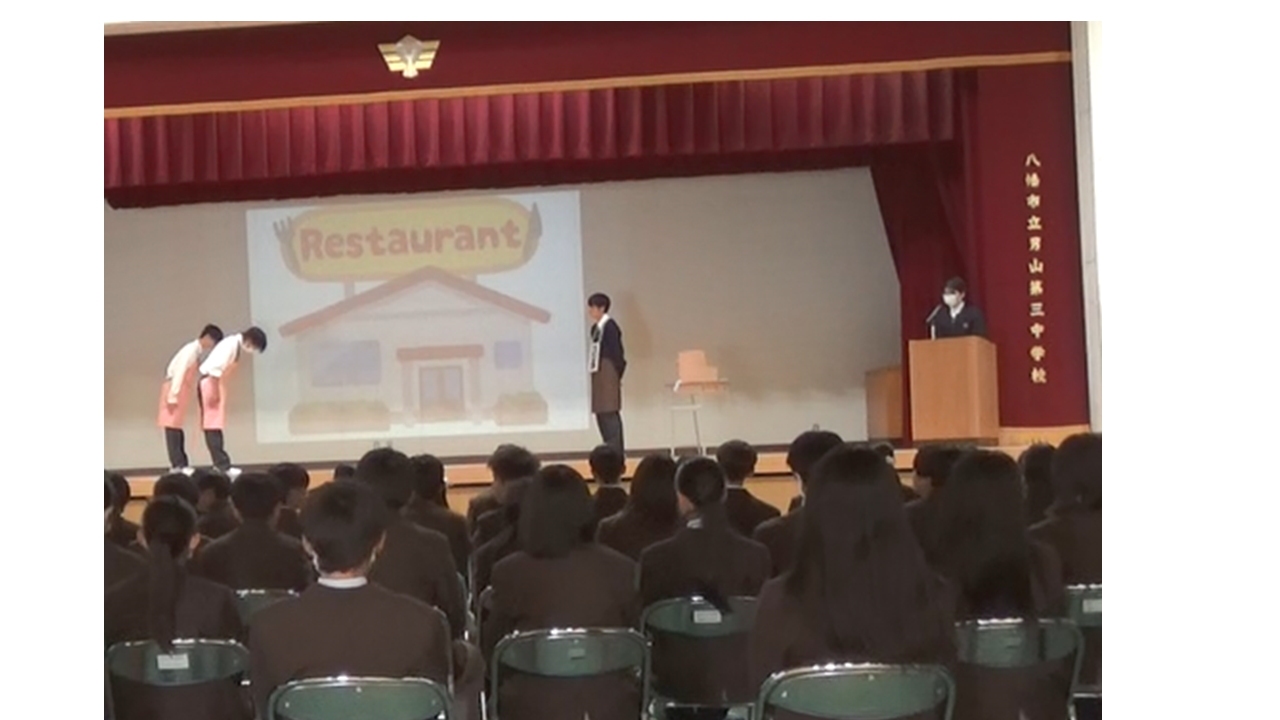2年生のマナー指導は、中学校の「職場体験」の事前学習としてご依頼をいただいたものです。今回は男山第三中学校と山城中学校に2つの班に分かれて実施しました。