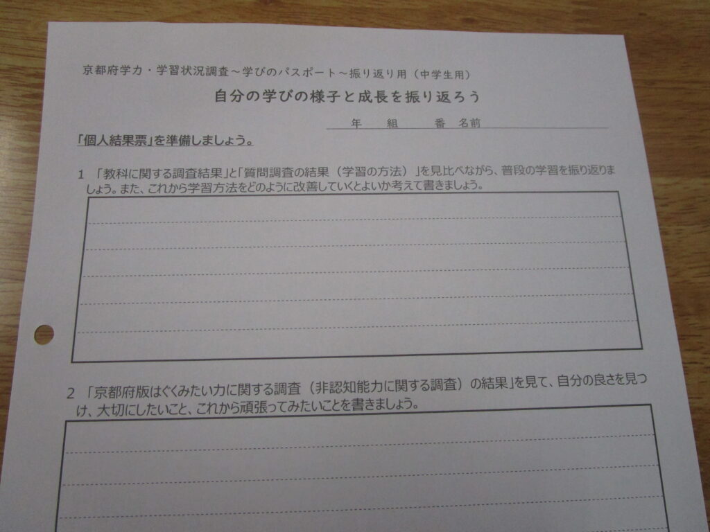 文化祭が来週に迫り、準備や練習に熱が入っています。そして、中間テストの2週間前になりました。駅伝大会や口丹新人大会などの行事も控えていますが、計画的に学習を進めていきましょう。また、1学期に受験した、京都府学力・学習状況調査〜学びのパスポート〜の結果の返却と振り返りを全学年行いました。教科の内容はもちろんのこと、質問紙の結果から自分のよさや、特徴を理解できたと思います。この結果を踏まえて、テスト勉強をどのようにしていくかを考えましょう。