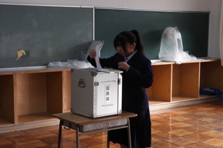 立会演説会後は選挙をしました。投票箱は実際の選挙でも使われるものをお借りしました。選挙管理委員が説明し、静粛に投票がおこなわれました。