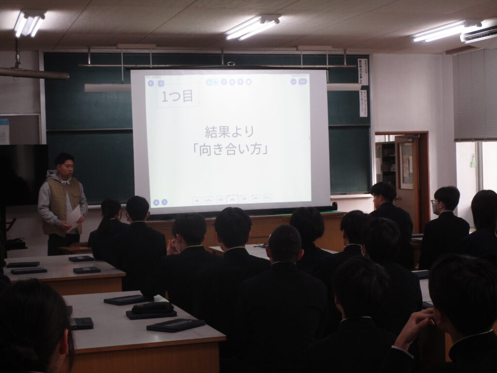 1時間目は学年集会でした。先生たちから3学期に頑張ってほしいことや来年度に向けて悔いの残らない学期にしようと話をされていました。