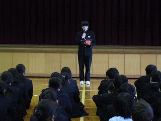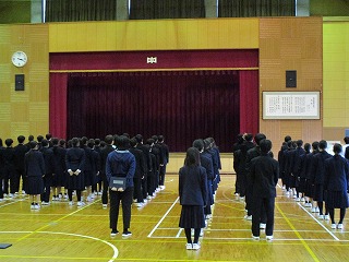 2月の全校集会を行いました。はじめに全校生徒で校歌を歌い、その後、専門委員長から活動報告がありました。