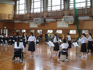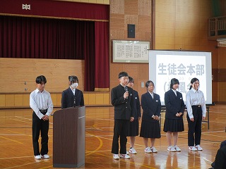 生徒会本部より、生徒会の組織や活動内容についての説明がありました。また、学校生活を送る上で大切な身だしなみについての話や、校歌の練習も行いました。