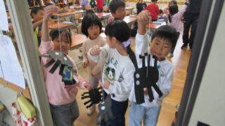 ハロウィンに合わせて1年生教室では、工作の真っ最中。