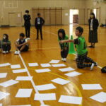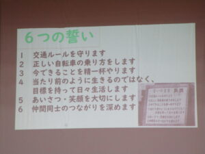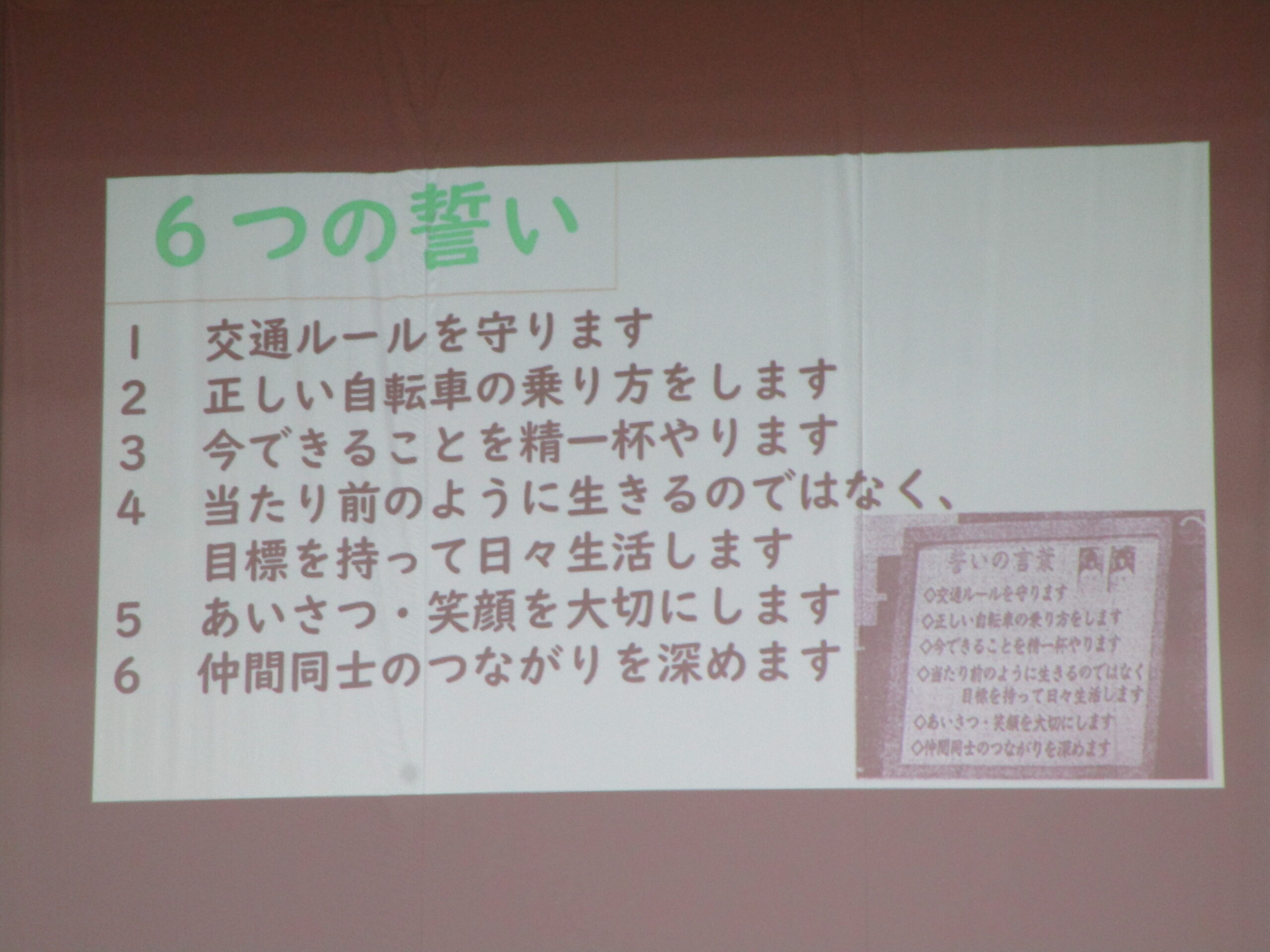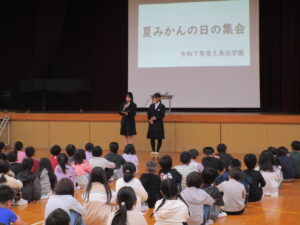 本日は、久美浜中学校生徒会が全校集会にきてくれました。久美浜学園で大切にしている「夏みかんの日」について説明をし、「命・今・仲間」 大切にしたい6つの誓いを全校で確認しました。