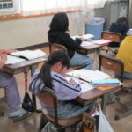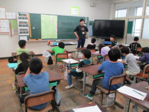 黒板に張り出された模造紙新聞には、どんな内容を、どんな風に書きまとめればよいのかポイントが押さえてあります。自分達が出会ってきた「○○名人」を多くの人に知ってもらいたい、そんな気持ちを込めた新聞です。「何を書いていいか分から~ん」という声もありますが、友達にアドバイスももらいながら制作中です。