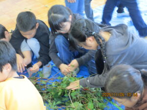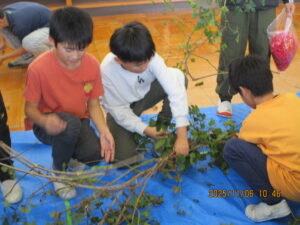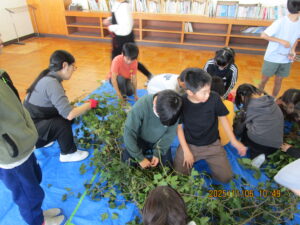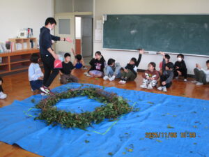 今日は、土台にできそうなツルをみんなでまとめていきました。(実際のコウノトリはツルは使いませんが・・・。)ただ、作って終わりではなく、この巣づくりを通して地域(外部)に伝えたいことがあるようです。