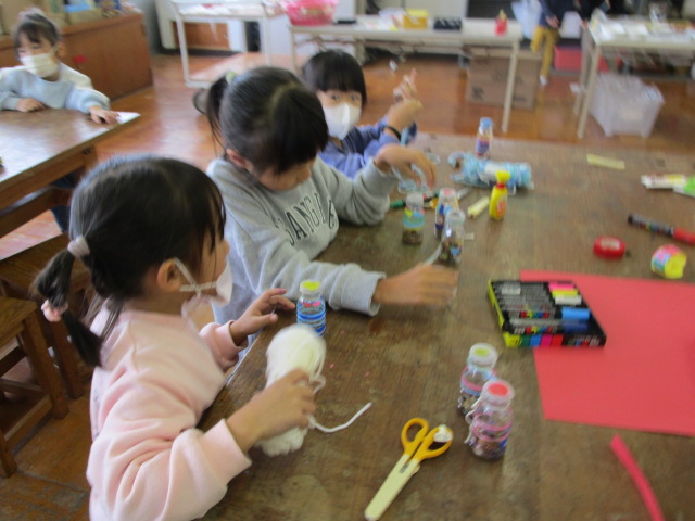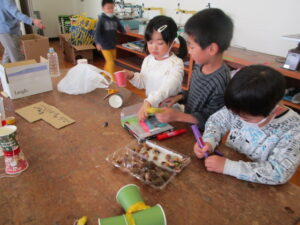 葉っぱや木の実を色付けしたり、廃材と併せておもちゃに変身させたり・・・。楽しみながら工夫いっぱいの祭りの準備が進んでいます。