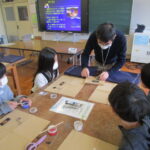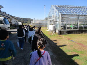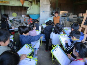 2年生の校区探検で出掛けたのは、校区にある石材店と高等学校。地域に出掛ける度に新しい出会いや発見をして、どんどん自分達の住む町が自慢の町になっていっているようです。石材店では、たくさんある機械に興味深々です。
