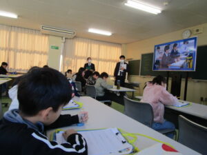 高等学校では、高校生が座っている椅子に座って、どんな勉強をしているのか話を聞きました。広い敷地の中も案内してもらいワクワクしました。