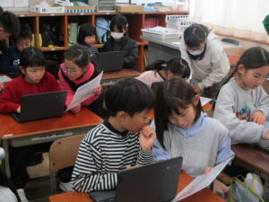 今年度、初めての試みである「KOURYU-time」。タブレットを活用した学習や、プリント学習を、高学年が低学年に優しく教えてくれています。