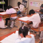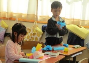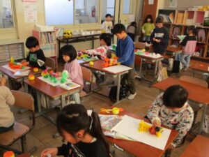 1年生の図画工作。色々な色のお花紙を重ねたり、くしゃくしゃに丸めたり・・・。イメージに近づくようにボンドで固定をしながら立体作品制作の真っ最中です。画用紙から飛び出す立体の絵。どの作品にも物語があって、素敵な作品ばかりです。
