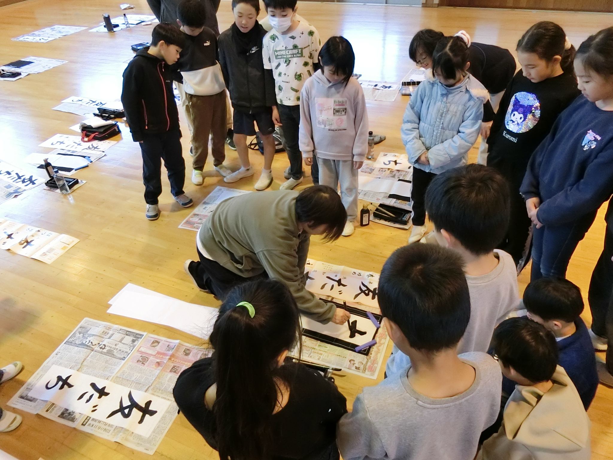 まずはお手本を見せていただきました。いつもは机の上での習字ですが、画仙紙が長いので床での習字です。ここでは姿勢がとても大事。どうすれば、満足のいく文字が書けるのか、先生の筆運びをジッと見つめる子ども達。