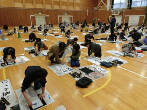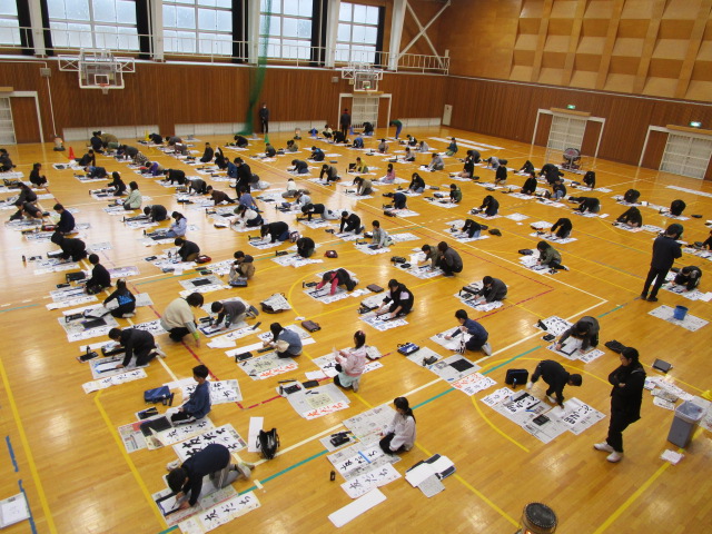 とても寒い日となりました。本日は「書初め大会」。1・2年生は教室で硬筆に挑戦し、3~6年生は体育館で毛筆に挑戦しています。