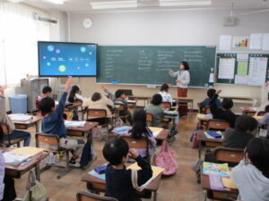 2年生の生活科では、「自分のできるようになったこと」「好きになったこと」をワークシートに書き出しています。黒板には、友達の意見がたくさん書かれていて、それを参考に自分のワークシートに加筆する子もいます。