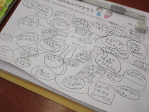 書く場所がなくなるくらいワークシートがいっぱいになると、この1年間でたくさんできるようになったことがある(成長した)自分を振り返ることができます。たくさんのできるようになったことを交流することで、とても満足そうな表情の2年生の姿がみられました。