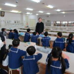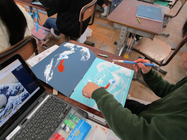 3年生になって初めての版画。彫刻刀を慎重に扱いながら作品作りをしています。今回挑戦するのは、日本版画の代表的な作品を模写すること。それぞれが選んだ作品を彫り進め、絵の具で色付けをしていきます。