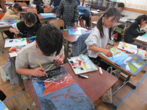 絵の具を乗せる場所や水の量を加減し、慎重に最後の仕上げです。絵の具が自然と混ざり合いグラデーションになるところが、こだわりポイントのようで、「見て見て!!」と自分の作品を見せてくれました。最終みんなの作品がずらっと並んだら、きっと素敵だろうなぁ・・・。と想像して楽しくなってきました。