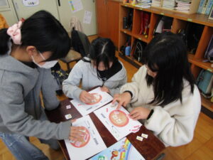 まずは、自分のオリジナルピザに必要な具を集めていきます。上手に友達に声を掛け英語でやり取りをする子ども達。