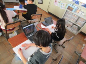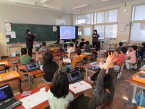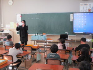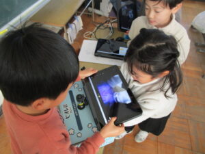「あれ?なんか青くなっている。」とみんなビックリです。自分の手洗いを確認した後、もう一度、手洗いの仕方について学習しました。昼休みの手洗いの様子を見ていると、指の間や手首まで、しっかり洗う姿が見られました。