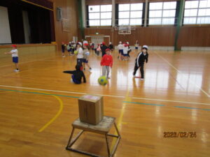 体育館全面をつかって、ボール遊びの真っ最中。あちこちに段ボールの的が置かれていたりや、得点の書かれたポスターが貼ってあったりします。思うように狙ったところにボールがとばなくでも、何度でもチャレンジする子ども達。