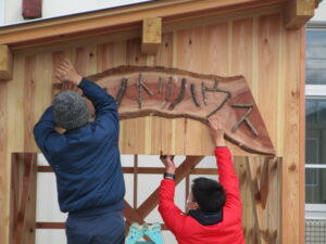 手作りの看板は、桜を中心とした木の枝でできています。今日は、大工さんにしっかり取り付けていただきました。