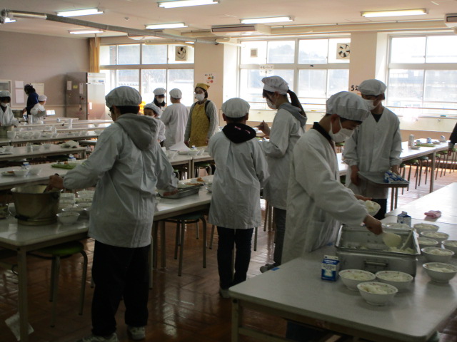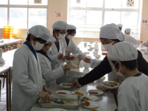 ランチルームの配膳風景です。短い時間に、5~6人の当番が学級の人数分の給食を準備します。汁の配分も手慣れたもので、あっという間に準備をすることができます。大好きな給食の時間。温かいものは温かいうちにいただけるよう協力している様子が素敵ですね。