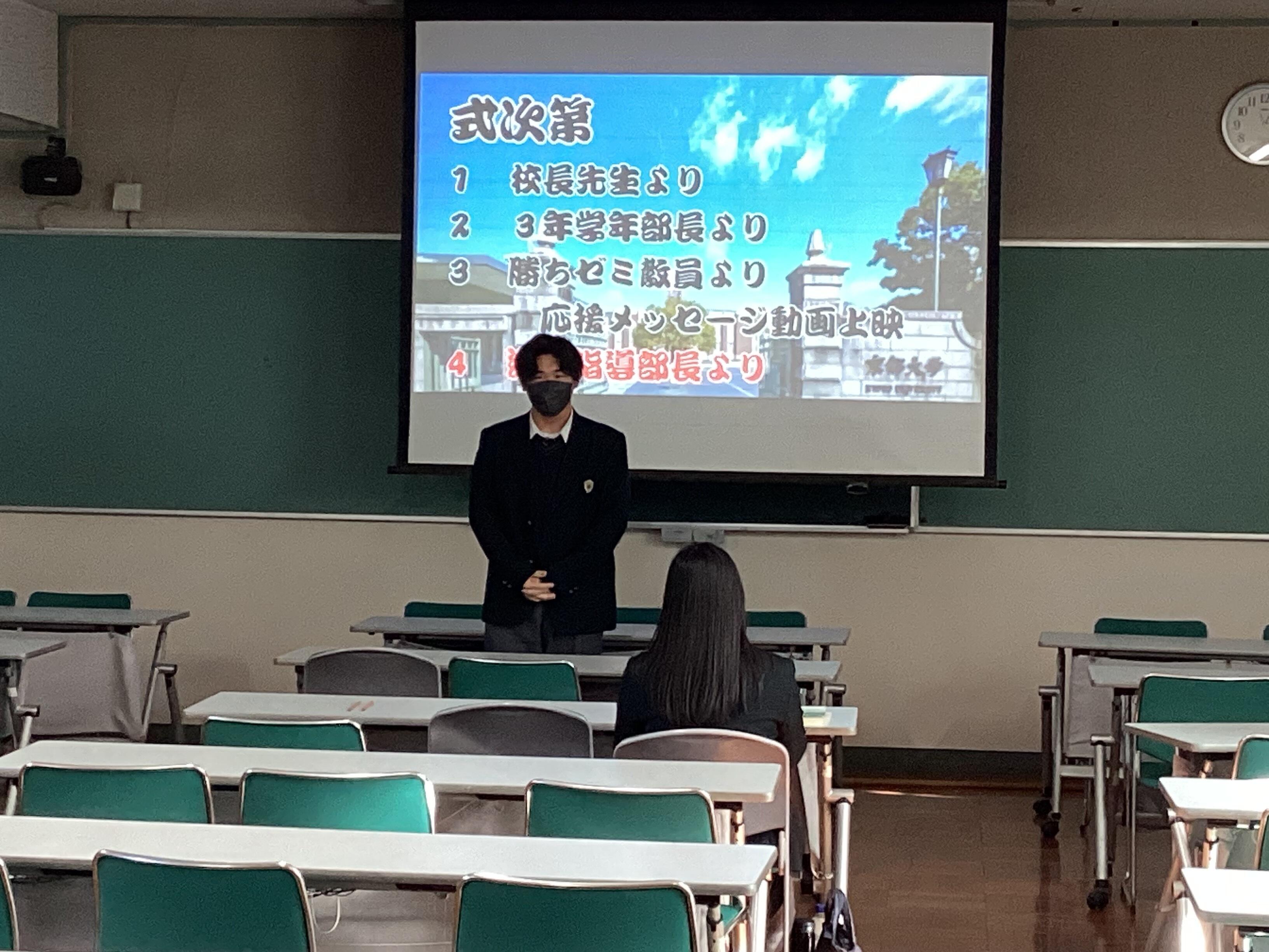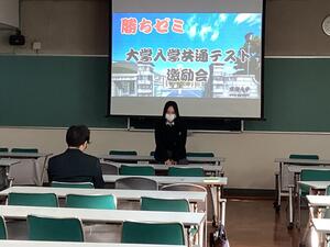 校長や学年の先生からのお話、進路部長からはお守りの鉛筆をもらいました。また、先日撮影した勝ちゼミ担当教員の応援メッセージ動画を見た後、1人ずつ当日に向けて抱負を言いました。