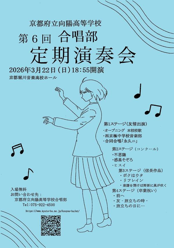 第6回定期演奏会を令和8年3月22日(日)に開催します。入場無料で18:55開演予定です。ぜひ、聴きに来てください。※第2ステージの曲目を変更しました。夏のコンクールの課題曲・自由曲を全力で披露します。