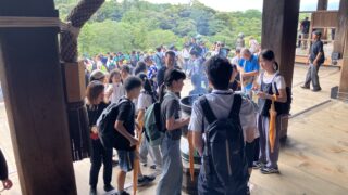 学校の様子 【修学旅行1日目】清水寺 清水寺の音羽の滝でお水をいただいています。ご利益があると信じて手を清め少し口に水を含んでいます。とっても元気です。先ほどはおやつを美味しそうにほおばっていました。この後カレーライスをいただきます。 2025.09.25 学校の様子