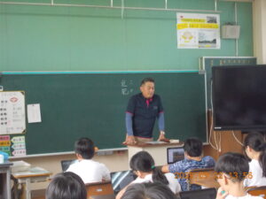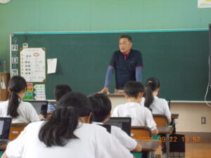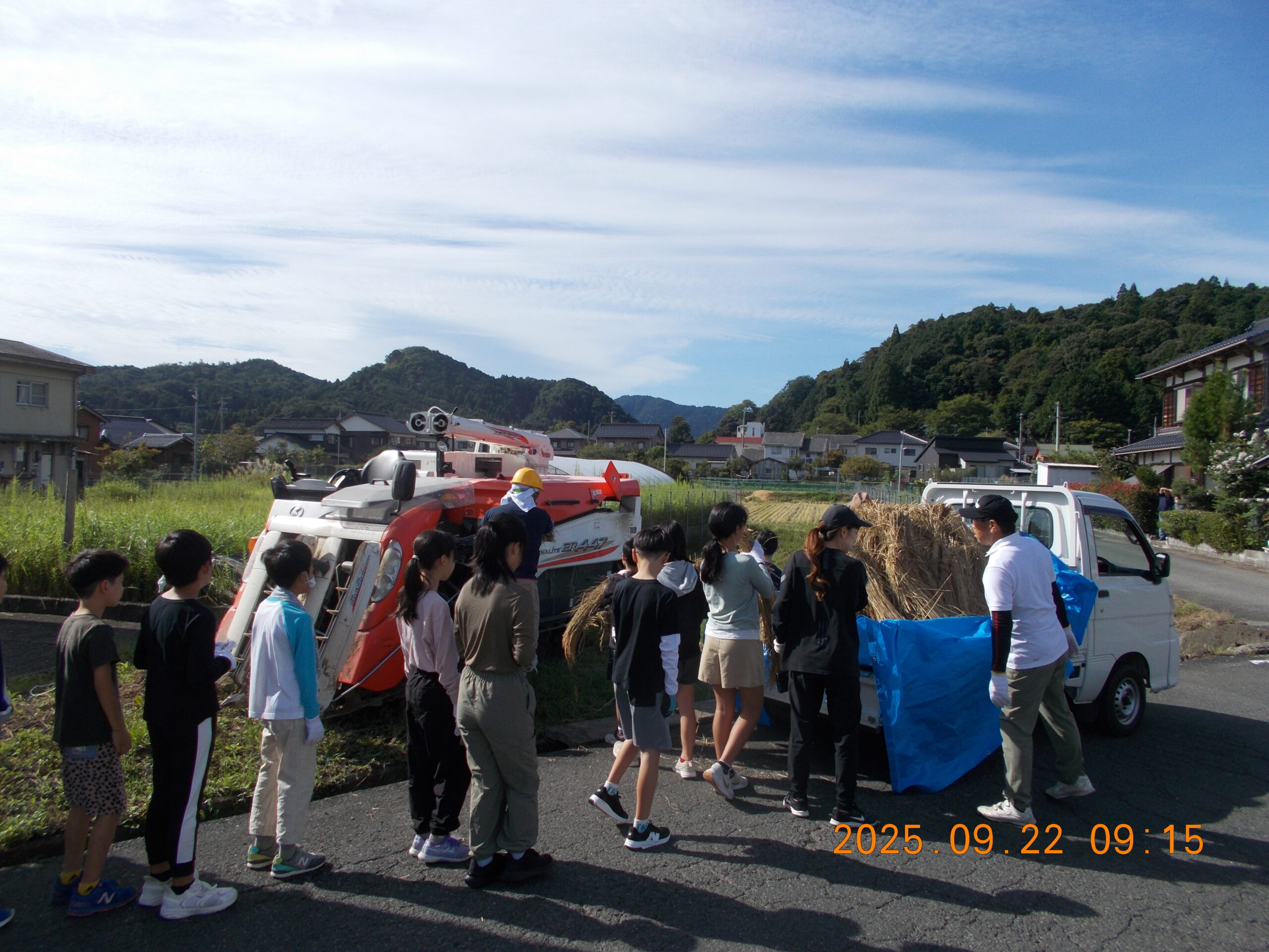 5年生は、22日田んぼとの管理をお世話になっている竹中様に刈り入れたお米の脱穀作業をして頂きました。例年よりも多く収穫できたようで、途中袋に入れたモミがあふれ出るハプニングもありました。その後は、作業場で精米にする工程の説明も受けました。さらには、午後からは教室に来て頂き米作りについてのお話を丁寧にしていただき、積極的に子ども達は質問する等活発化授業となりました。お米の魅力をつかむ良い1日となりました。