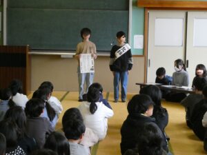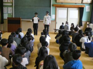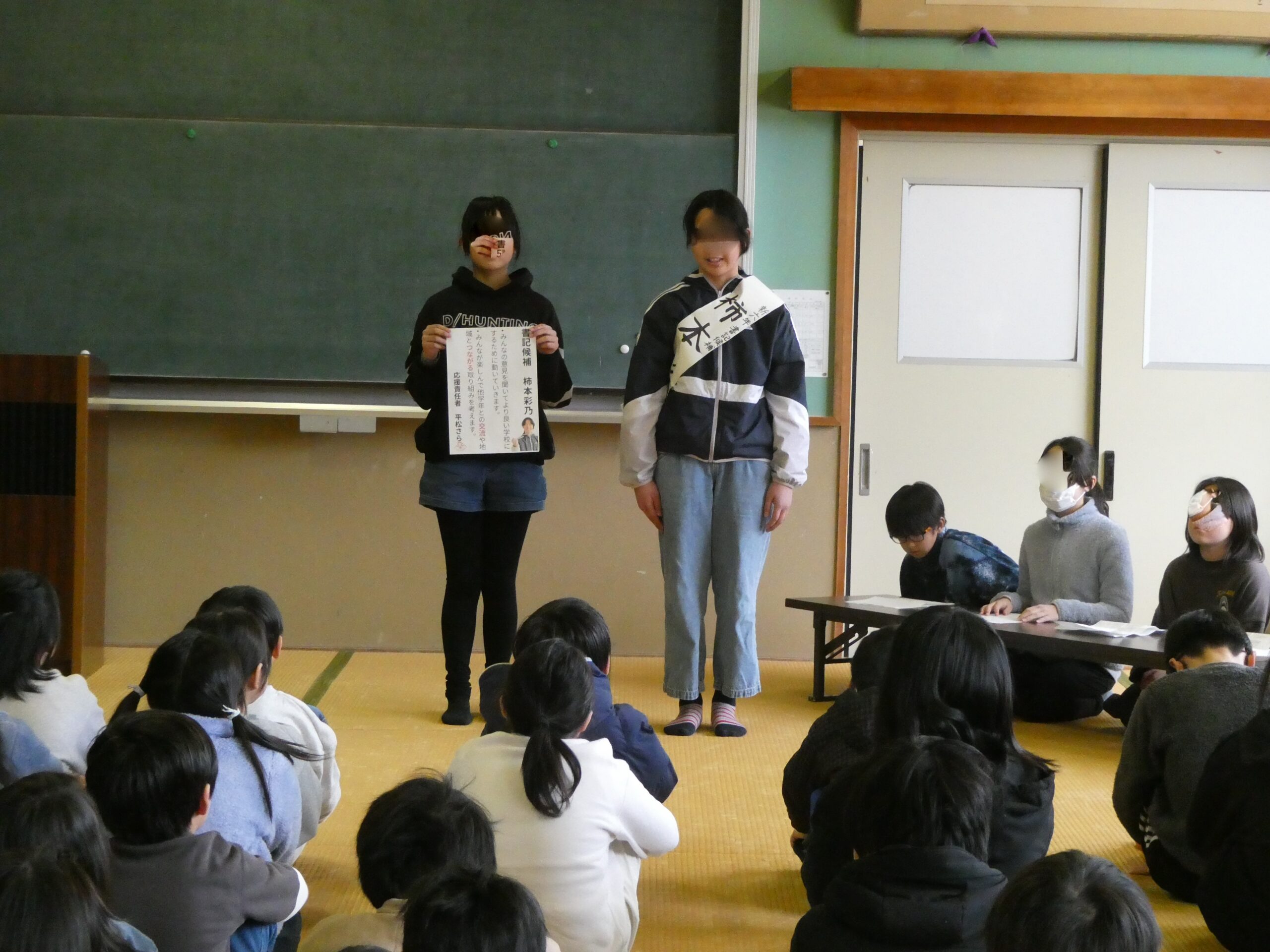 学校の様子20日は次年度前期本部役候補の立会演説会がありました。4,5年生候補者、応援者はこの演説会に向け、ポスターの作成、タスキ作り、演説文やその発表練習を積み重ね、事前にリハーサルを何回も行い当日を迎えました。公約、そのための自身の強みや決意を具体的でわかりやすく表明しだれが当選しても立派な児童会役員となれるそんな発表でした。惜しくも落選した人もいましたが、その過程こそが大切です。当選者はその人たちの思いも二重に感じていることと思います。来年度の児童会活動が楽しみです。